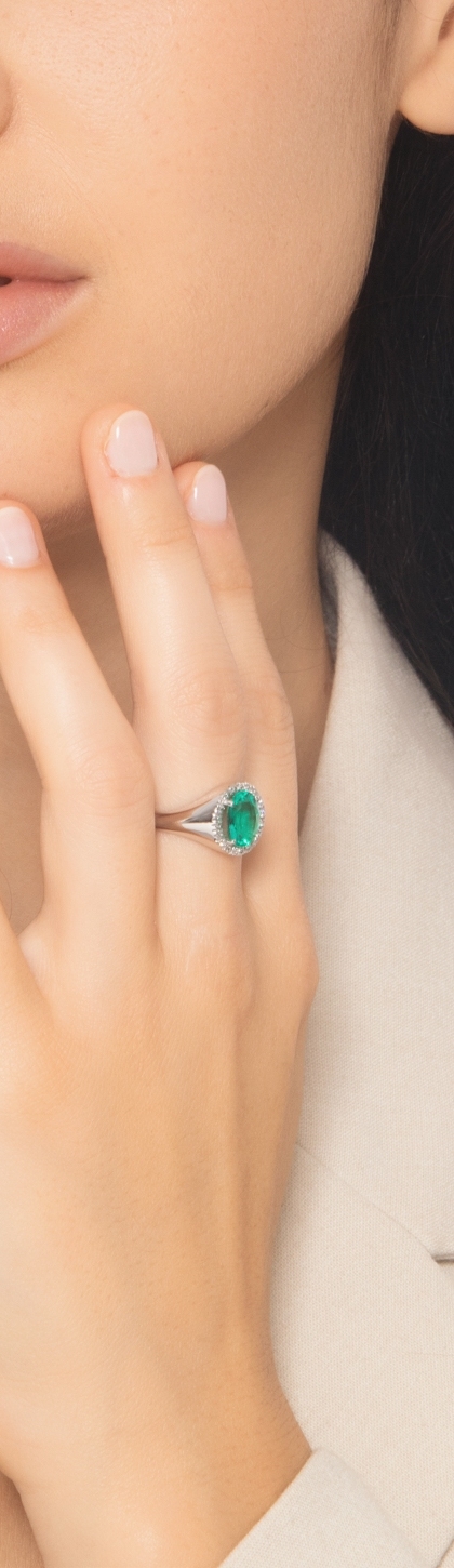 Anello chevalier in oro bianco 18k con smeraldo ovale e diamanti