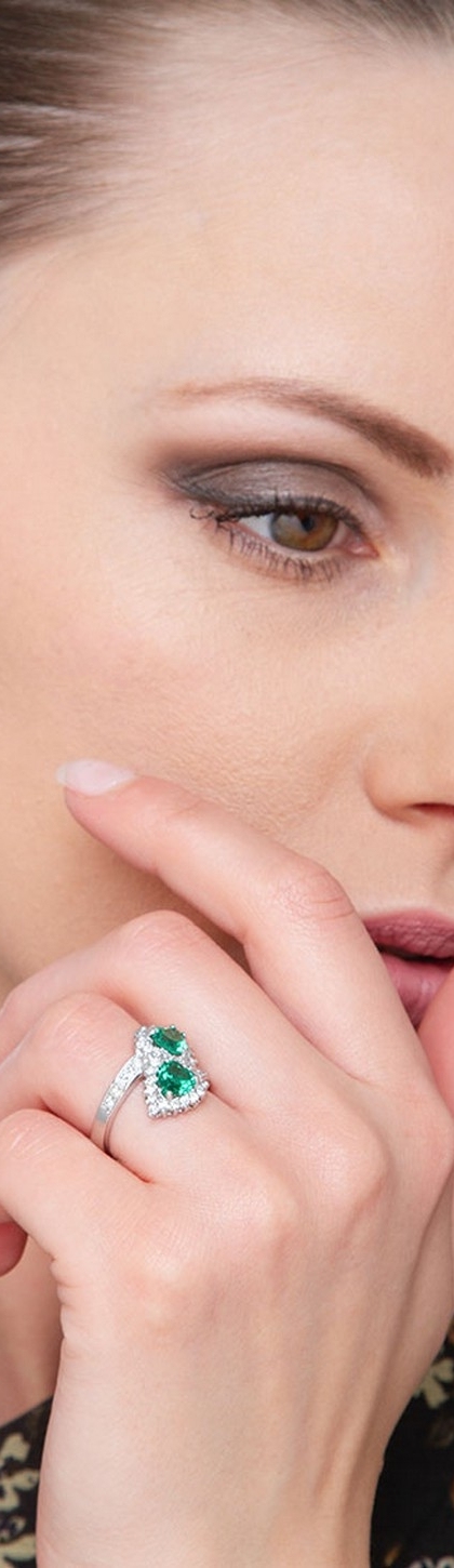 Anello contrariè in Oro Bianco 18k, con incastonati due smeraldi taglio a cuore contornati da diamanti colore G purezza Vs taglio brillante.