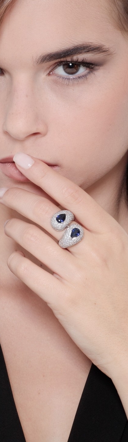 Anello contrariè in Oro Bianco 18k con Zaffiri blu a goccia e Diamanti.