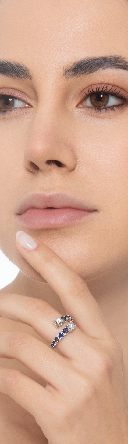 Anello contrariè in oro bianco 18k con zaffiri blu e diamanti