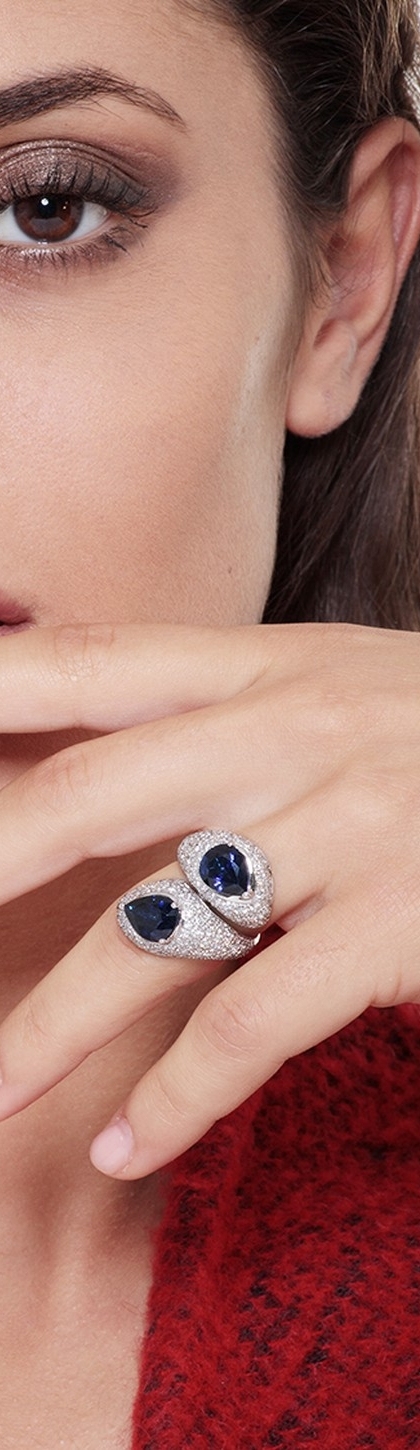 Anello contrariè in Oro Bianco 18k con Zaffiri Blu taglio a goccia e Diamanti