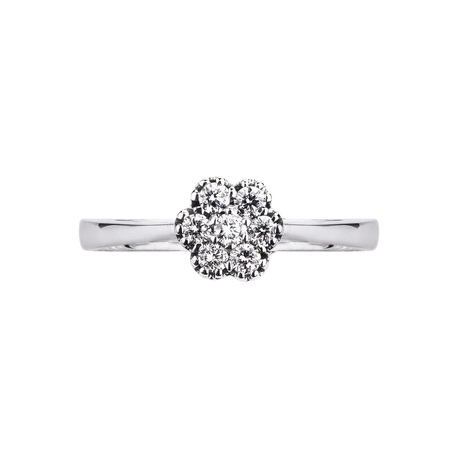 Anello fantasia in Oro bianco 18k con il gambo in stile moderno e semplice e diamanti taglio brillante di colore G e purezza Vs. I diamanti sono incastonati a fiore in modo da rendere l'illusione che sia un unica pietra.