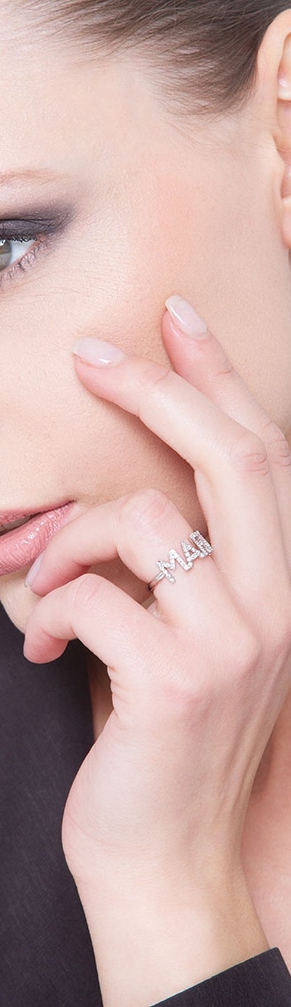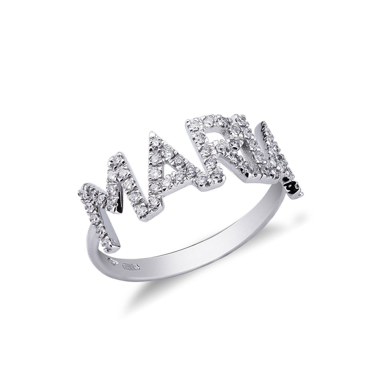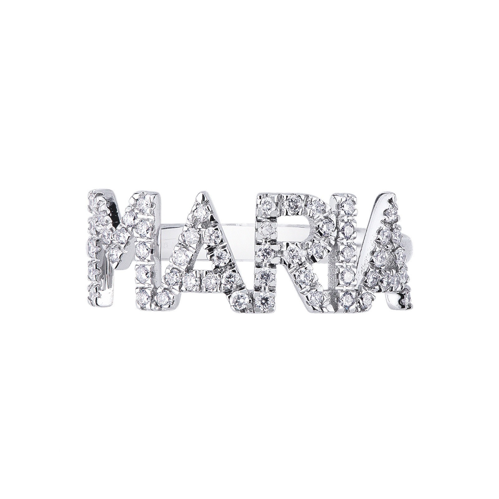Anello in Oro bianco 18k, con il nome MARIA incastonato di diamanti taglio brillante colore G e Purezza Vs. Altezza lettere 8 mm.