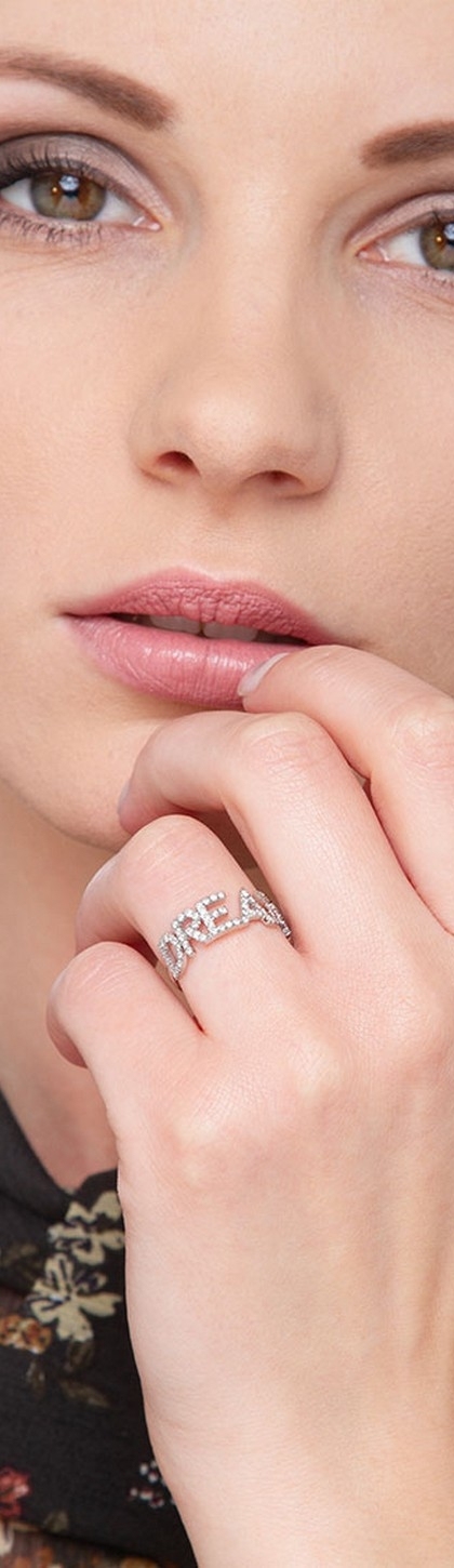 Anello in Oro bianco 18k con la parola DREAMS incastonata di diamanti taglio brillante, colore G e Purezza Vs. Altezza lettere 8 mm.
