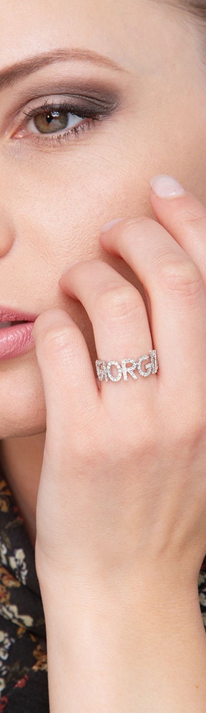 Anello in Oro bianco 18k, con il nome GIORGIA incastonato di diamanti taglio brillante colore G e Purezza Vs. Altezza lettere 8 mm.