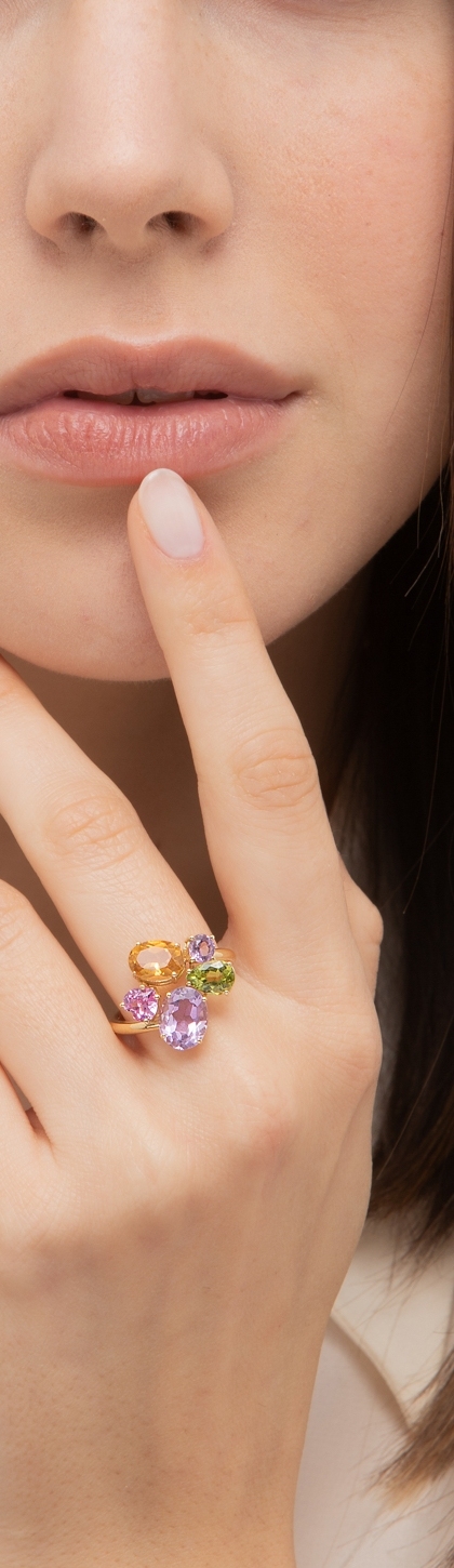 Realizzato in oro giallo 18k, il design mette in risalto una sequenza armoniosa di gemme incastonate: ametista, citrino, peridoto e zaffiro rosa si alternano in un elegante gioco cromatico che illumina il dito con grazia.