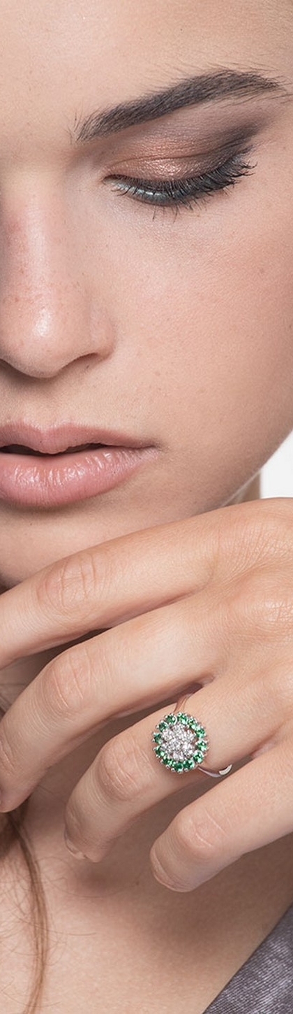 Anello fantasia in Oro Bianco 18k con smeraldi a contorno e diamanti