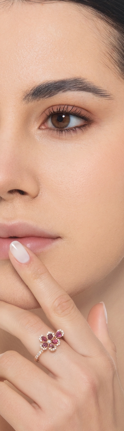 Anello fiore in oro rosa 18k con rubini e goccia e diamanti