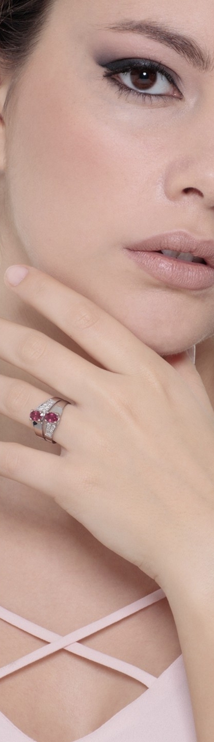 Anello in oro bianco 18k con 2 rubini centrali e diamanti.