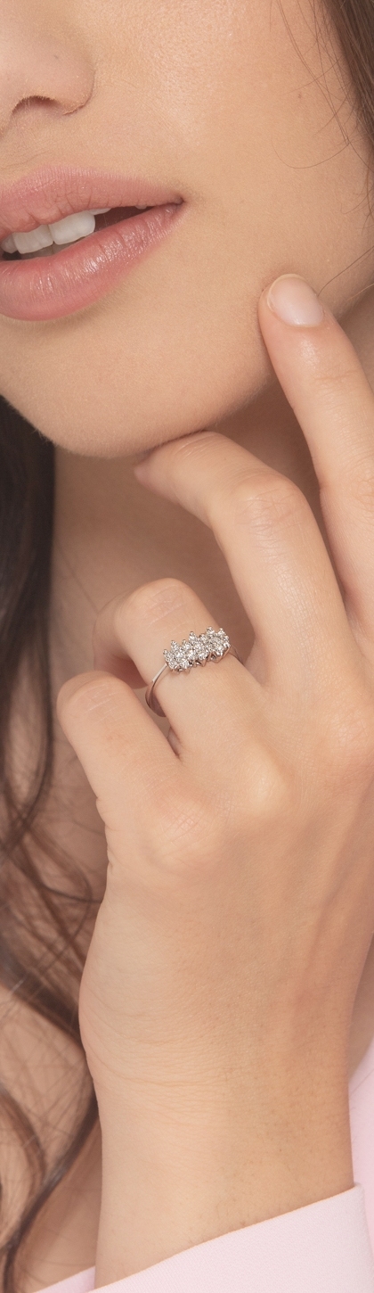 Anello in oro bianco 18k con diamanti a formare 3 fiorellini