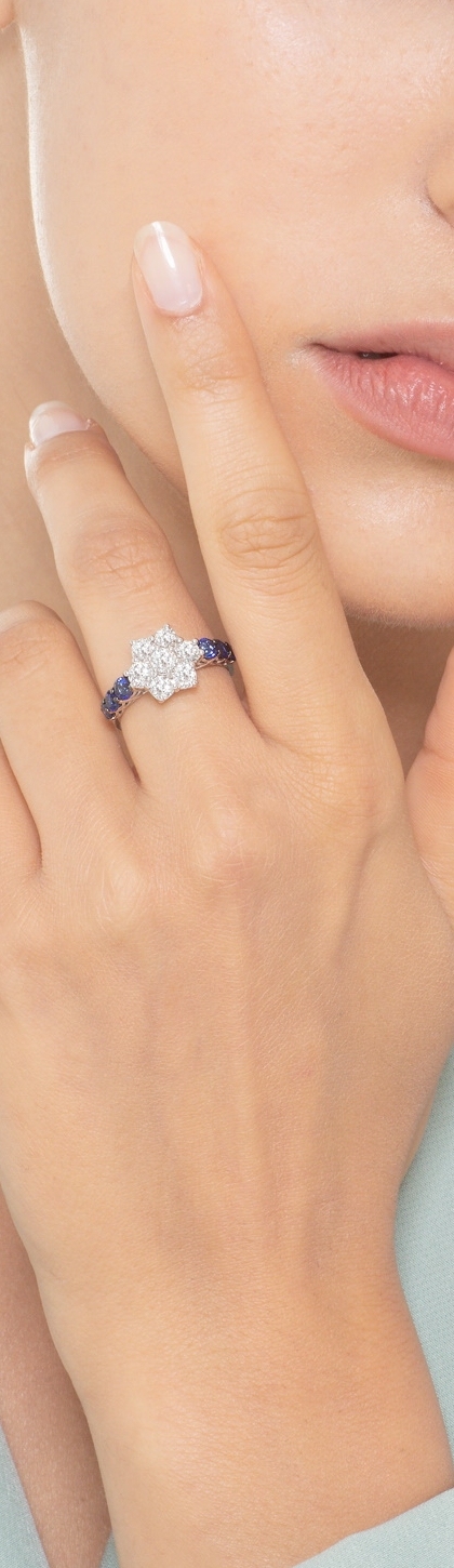 Anello in oro bianco 18k con diamanti e zaffiri blu e punte brunite