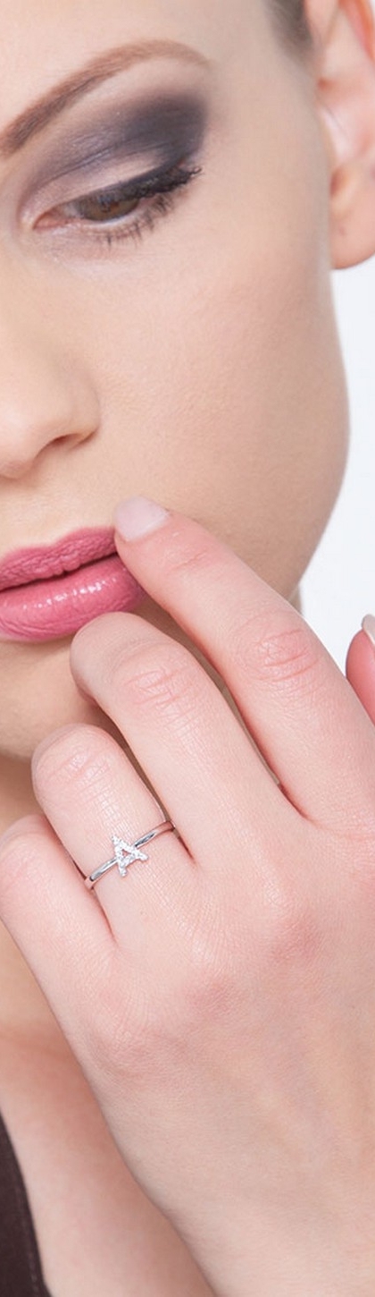 Anello in Oro bianco 18k, con lettera A incastonata di diamanti taglio brillante colore G e Purezza Vs. Altezza lettere 8 mm.