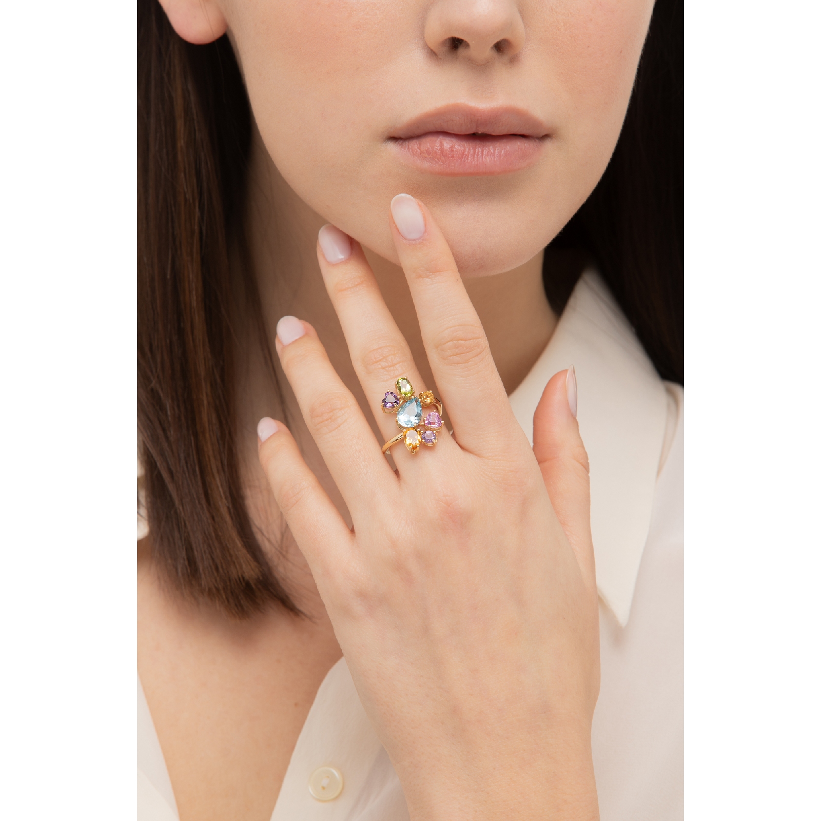 Le pietre preziose presenti sono: zaffiro rosa, ametista viola, citrino giallo e peridoto verde. Ogni pietra porta con sé il suo colore intenso e vibrante, alternandosi in un gioco di tonalità in cui la delicatezza dei toni pastello si sposa con vivacità e raffinatezza.