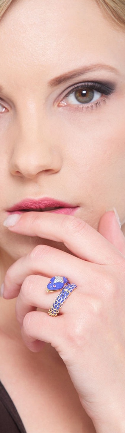 Anello in oro giallo 18k a serpente con diamanti e occhi in rubini