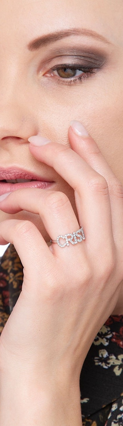 Anello in Oro bianco 18k con il nome CRISTINA incastonato di diamanti taglio brillante colore G e Purezza Vs. Altezza lettere 8 mm.