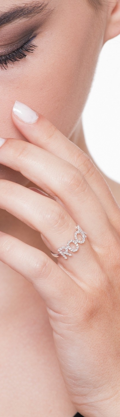 Anello in Oro bianco 18k, con la parola ROCK incastonata di diamanti taglio brillante, colore G e Purezza Vs.