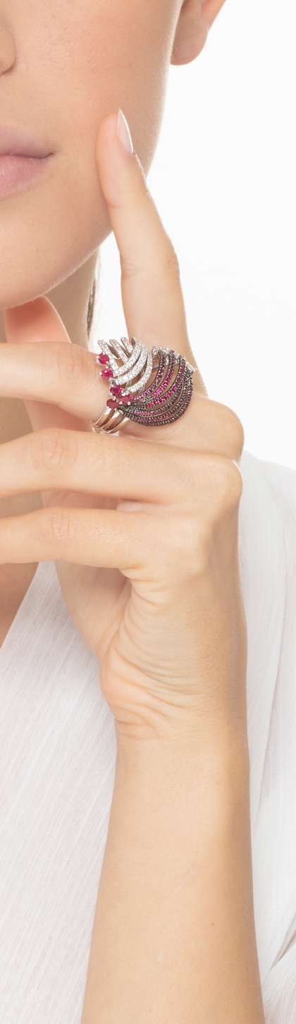 Anello a fascia in oro bianco 18k con rubini, su punte brunite, e diamanti