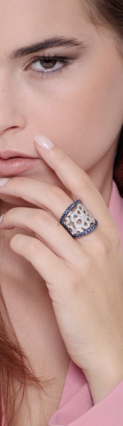 Anello fascia con motivo a ricamo in Oro Bianco 18k con Diamanti e Zaffiri blu