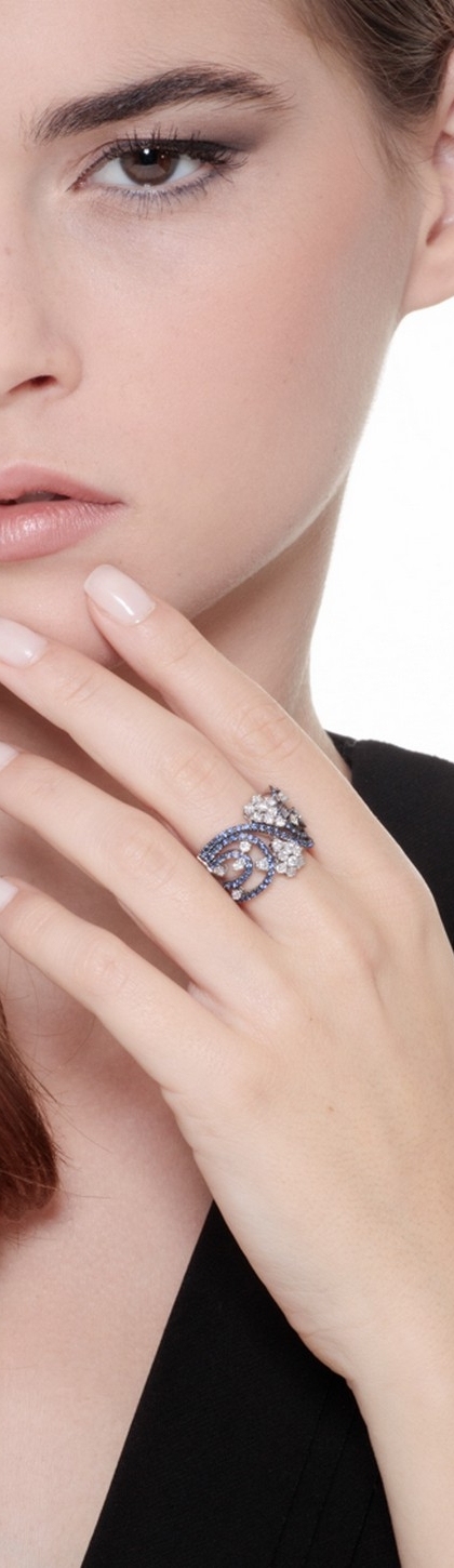 Anello fascia fantasia in Oro bianco 18k con Zaffiri blu e Diamanti.