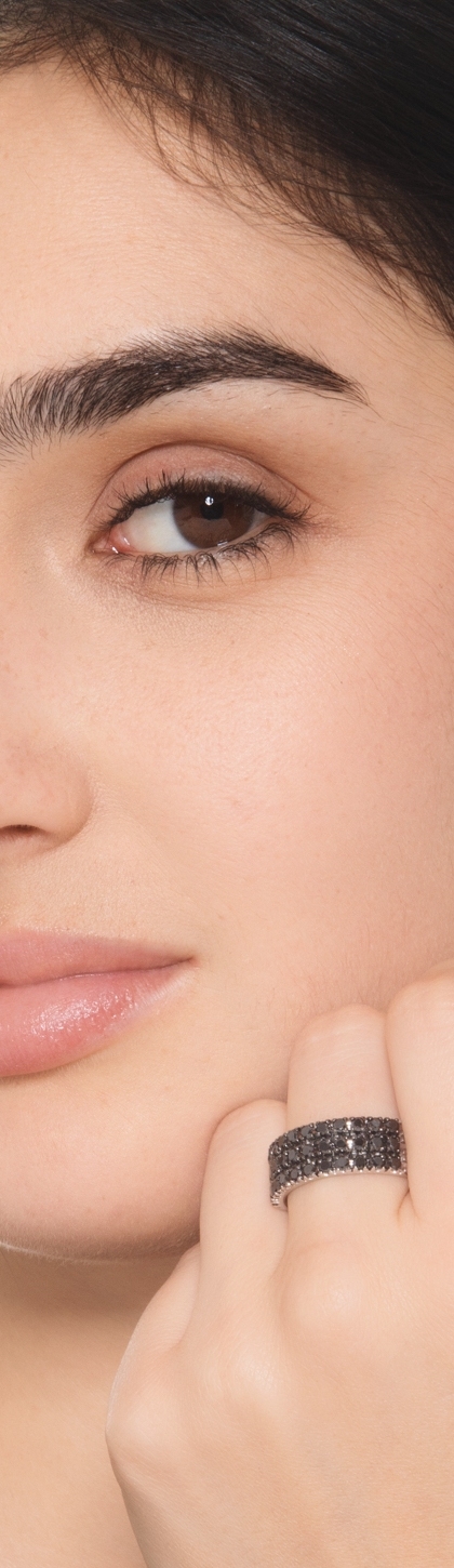 Anello fascia in oro bianco 18k con 3 file di diamanti neri e punte brunite, larghezza circa 8.5 mm