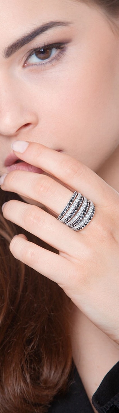 Anello fascia in Oro bianco 18k con incastonati diamanti taglio brillante, colore G, purezza Vs disposti su tre linee intervallate da diamanti neri taglio brillante.