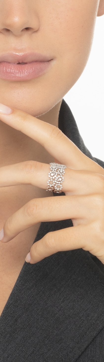 Anello fascia in oro bianco 18k con ricami e diamanti