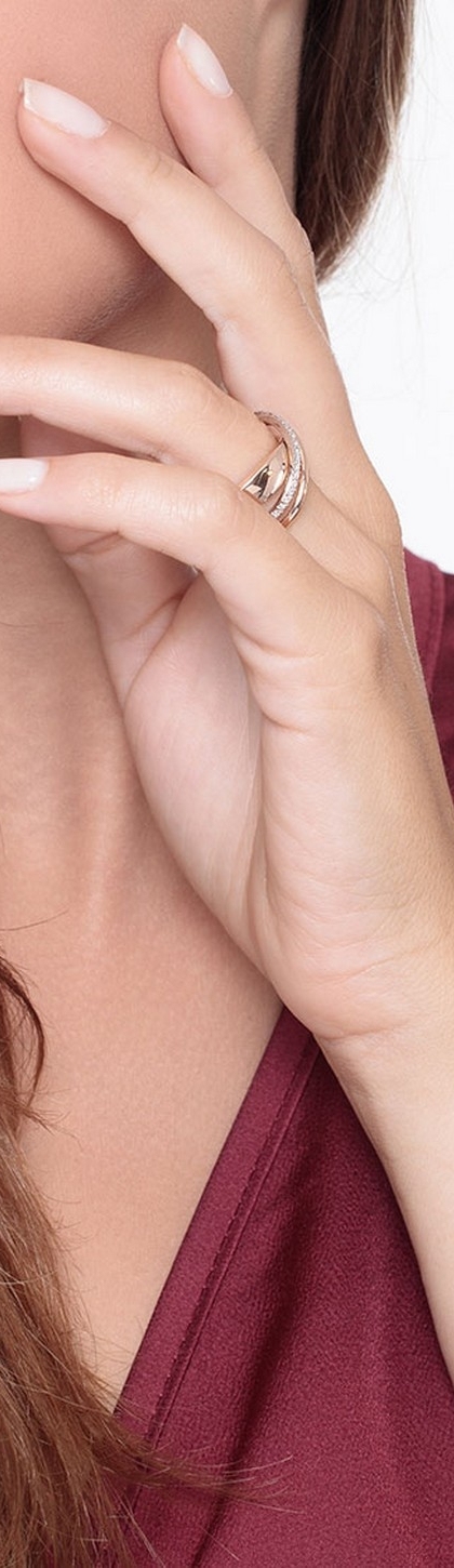Anello fascia in oro bianco e rosa 18k con incastonati diamanti taglio brillante colore G e purezza Vs. Anello con due fasce incrociate lisce di differenti larghezze con una in diamanti.