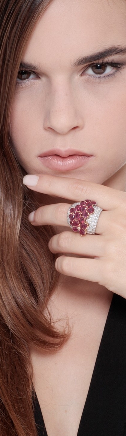 Anello fascia in Oro Bianco e Rosa 18k con incastonati Rubini a goccia e Diamanti