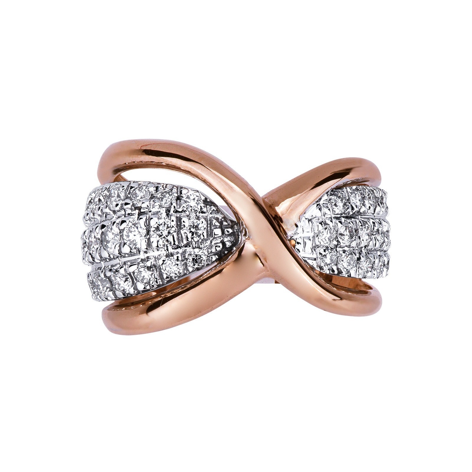 Anello ad incrocio in Oro bianco e rosa 18k, con incastonati nelle tre file laterlai diamanti taglio brillante. Colore G e Purezza Vs.