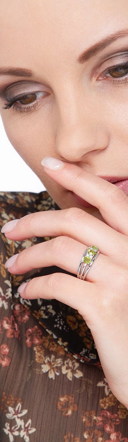 Anello da Donna Fascia tripla in Oro bianco 18k, con incastonati tre Peridoti taglio ovale divisi da quattro diamanti taglio brillante colore G purezza Vs.
