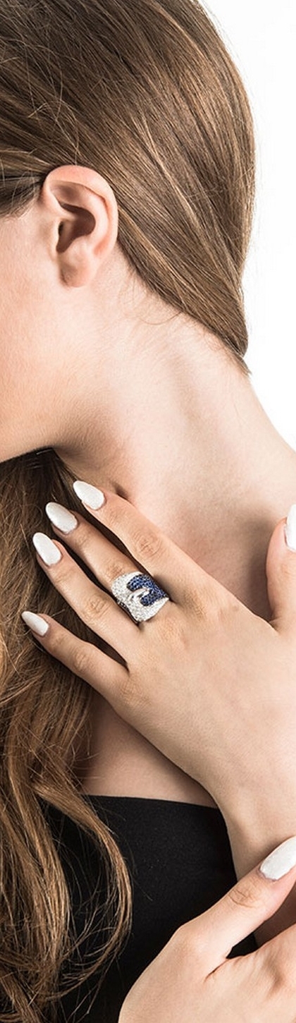 Anello Fibbia in Oro Bianco e Rosa 18k con Diamanti e Zaffiri blu