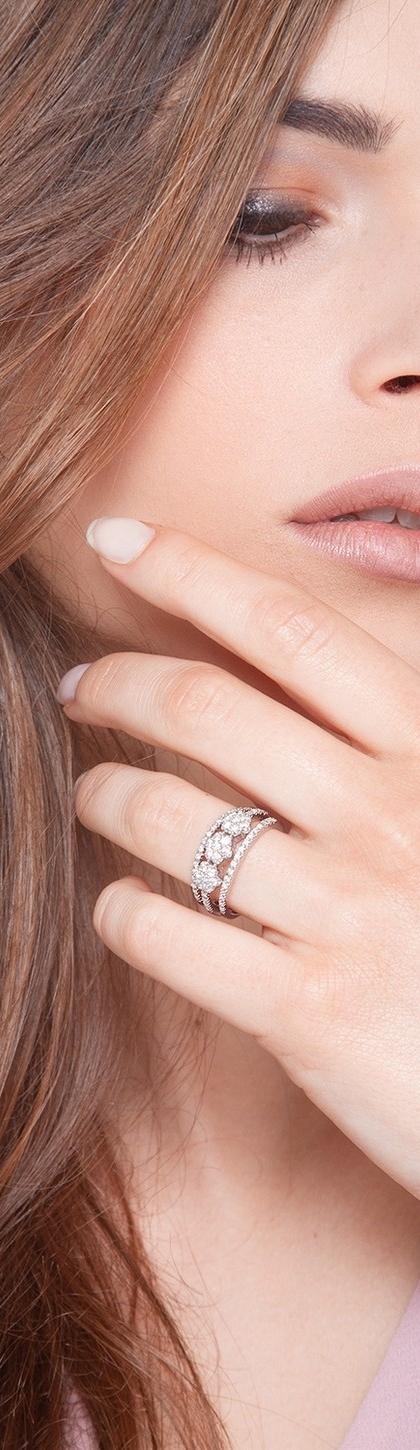 Anello in oro bianco 18k con 3 fiori in diamanti.