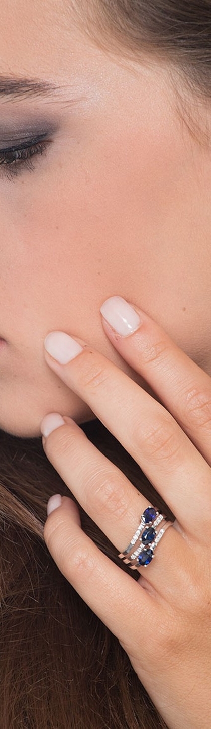 Anello in oro bianco 18k con diamanti e 3 zaffiri blu