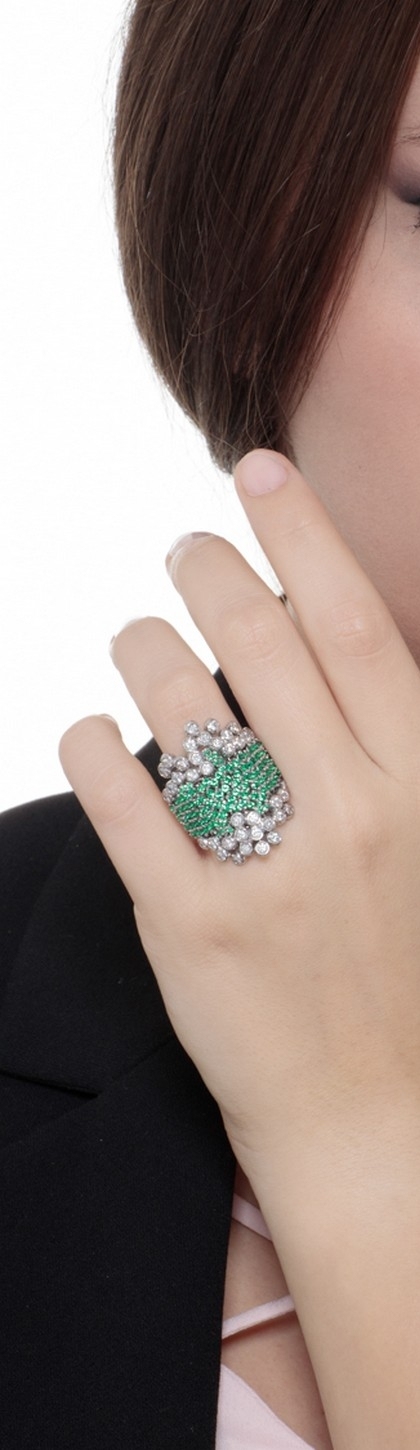 Anello in oro bianco 18k con diamanti e smeraldi nella fascia centrale
