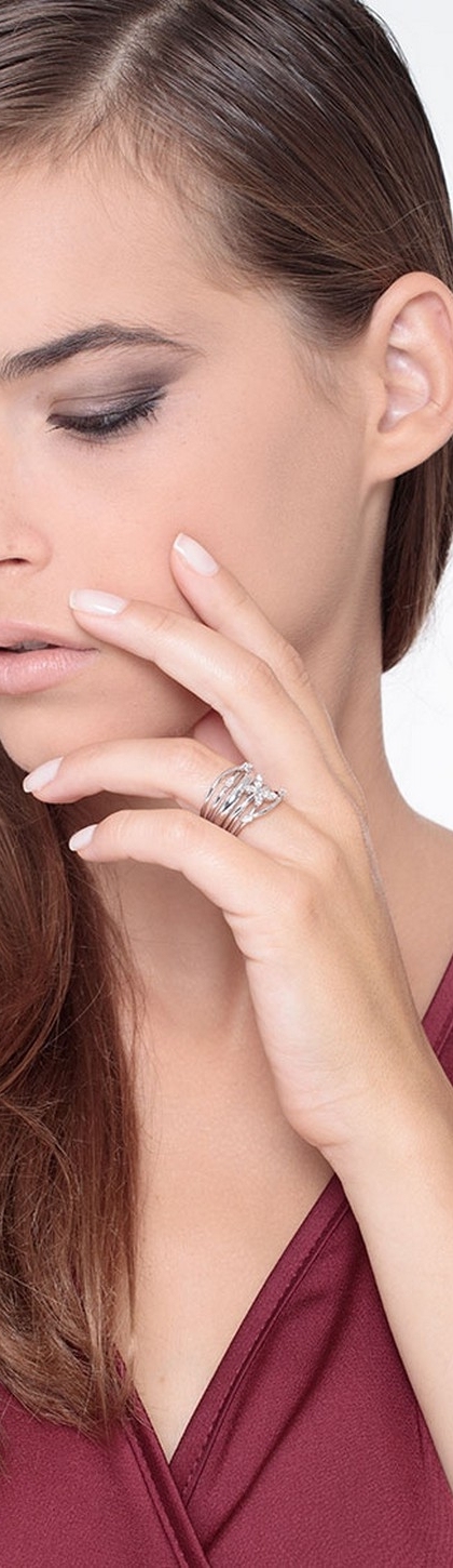 Anello fascia in oro bianco 18k con incastonati diamanti taglio brillante colore G e purezza Vs. Anello con sette fili intrecciati con incastonati diamanti a formare una farfallina. Larghezza massima anello 17 mm.