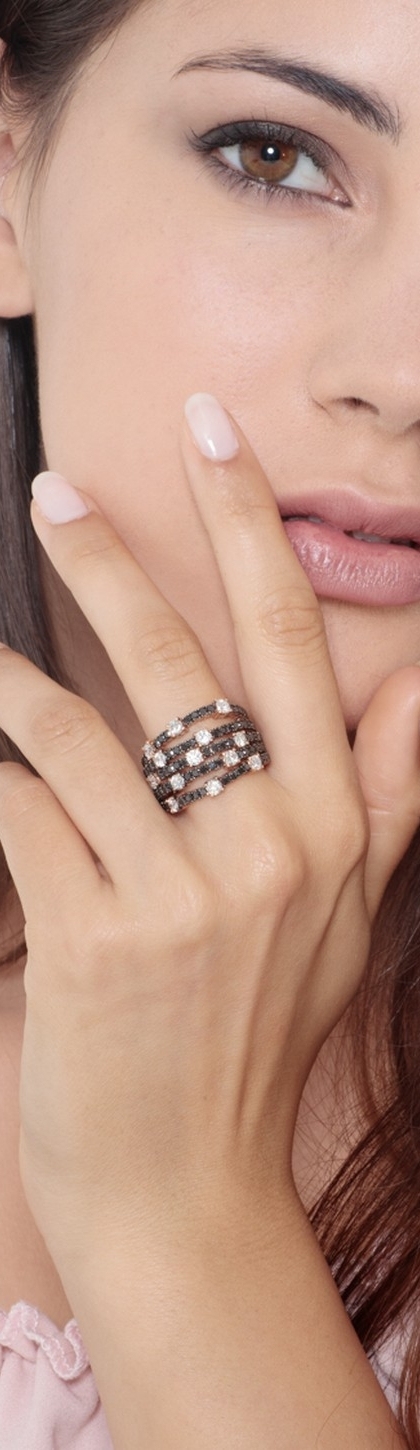 Anello tennis a 5 file in oro rosa 18k con diamanti neri e bianchi