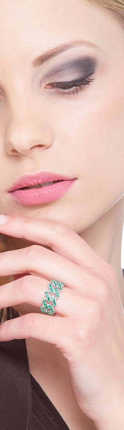 Anello maglia cuban link in oro bianco 18k con incastonati smeraldi taglio brillante.