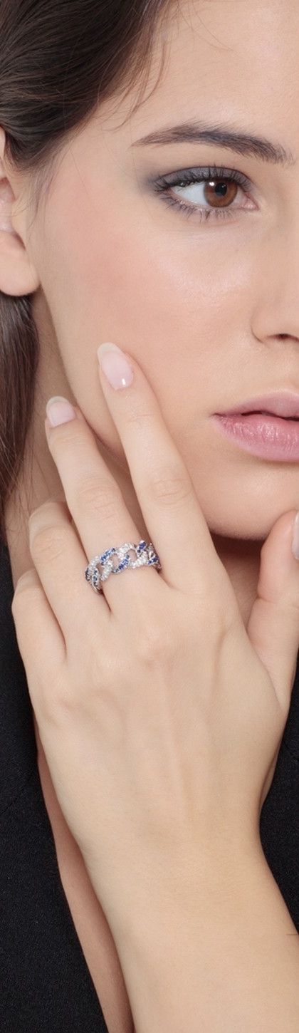 Anello groumette in Oro Bianco 18k con Zaffiri Blu e Diamanti