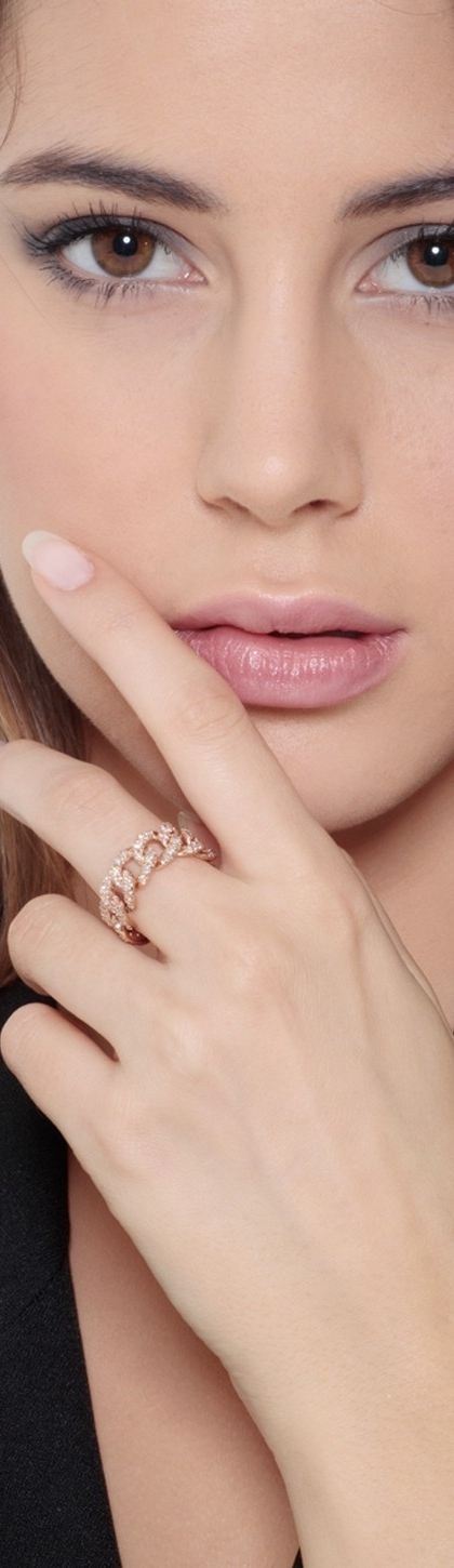Anello groumette morbido in oro rosa 18k con incastonati diamanti taglio brillante colore G e purezza Vs. L'anello è composto da 8 maglie che si adattano perfettamente al dito.
