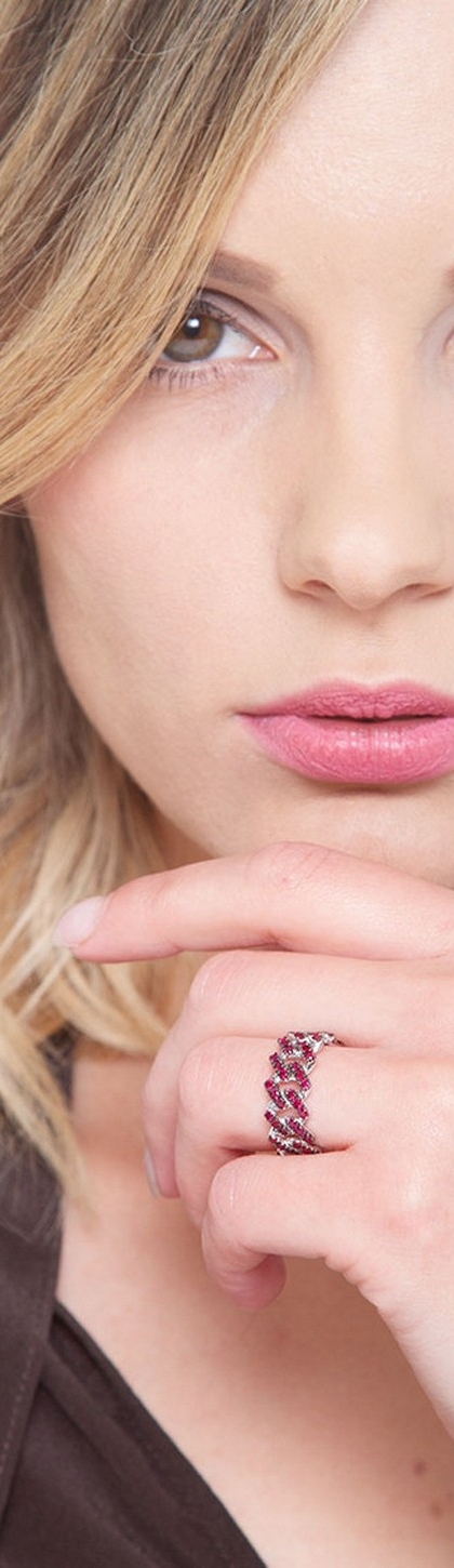 Anello maglia cuban link in oro bianco 18k, con incastonati rubini taglio brillante.
