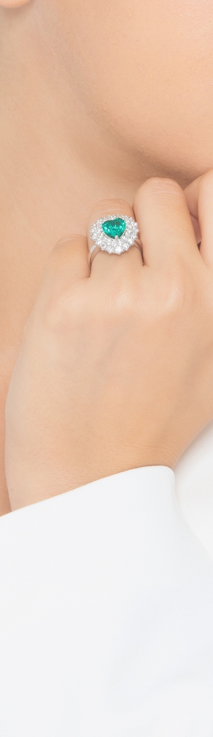 Anello a cuore in oro bianco 18k con smeraldo a cuore e diamanti