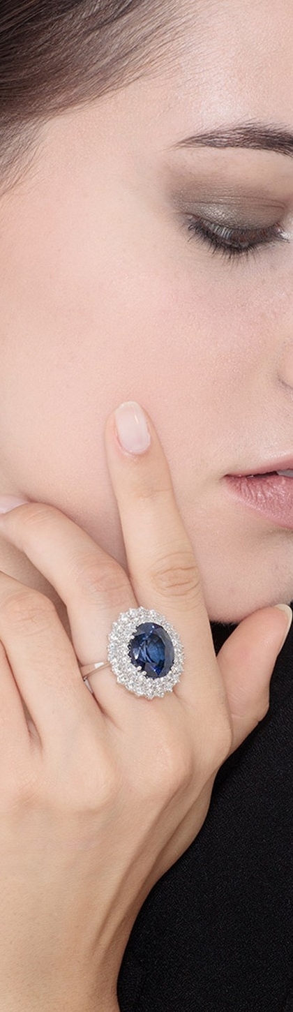 Anello a doppio contorno in oro bianco 18k con diamanti e Zaffiro blu ovale