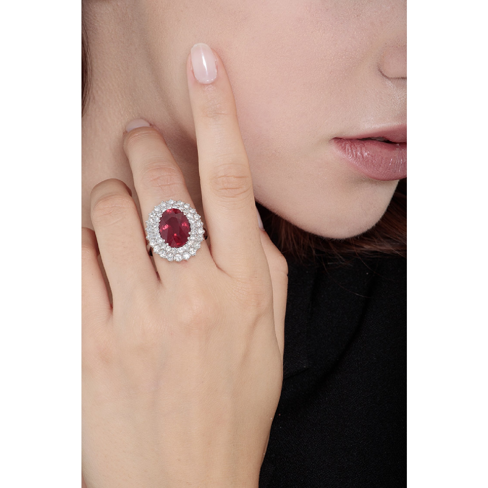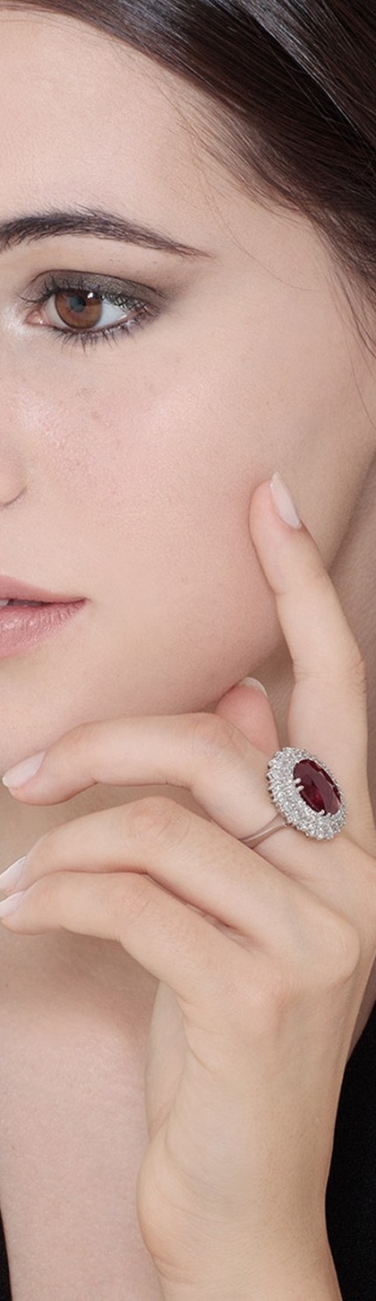 Realizzato in oro bianco 18k, l'anello è caratterizzato da un rubino centrale di circa 13.5x10mm, contornato da una doppia fila di diamanti taglio brillante, colore G e purezza Vs. Le sue dimensioni importanti, lo rendono ideale da indossare in eventi speciali. Inoltre, l'incassatura a griffe è molto popolare in gioielleria e viene usata per accentuare la luminosità dei diamanti.