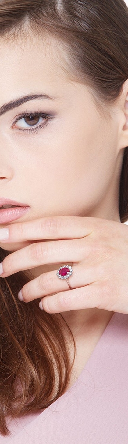 Quest'anello con rubino ovale centrale di circa 9x7mm è contornato da 12 diamanti taglio brillante di colore G e purezza Vs.