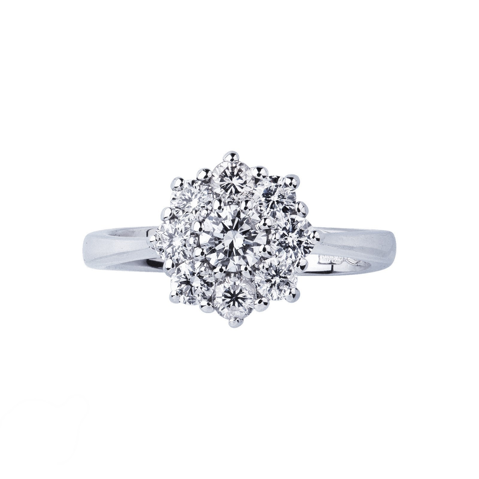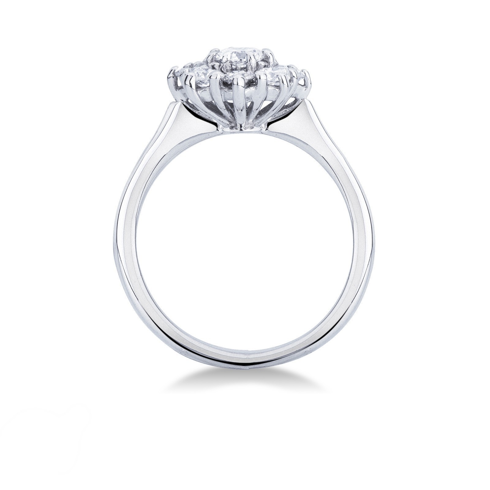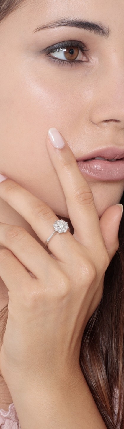 Quest'anello contorno in diamanti ha al centro un diamante di circa 0.25ct contornato da altri 8.Tutti i diamanti dell'anello sono taglio brillante, colore G e purezza Vs. L'incassatura a griffe ha una doppia funzione. Da un lato permette alla luce di colpire i diamanti in modo ottimale esaltandone la brillantezza, mentre dall'altro fa si che il design dell'anello ricordi un fiore. Inoltre, l'oro bianco 18k complementa il bianco dei diamanti, rendendoli protagonisti.