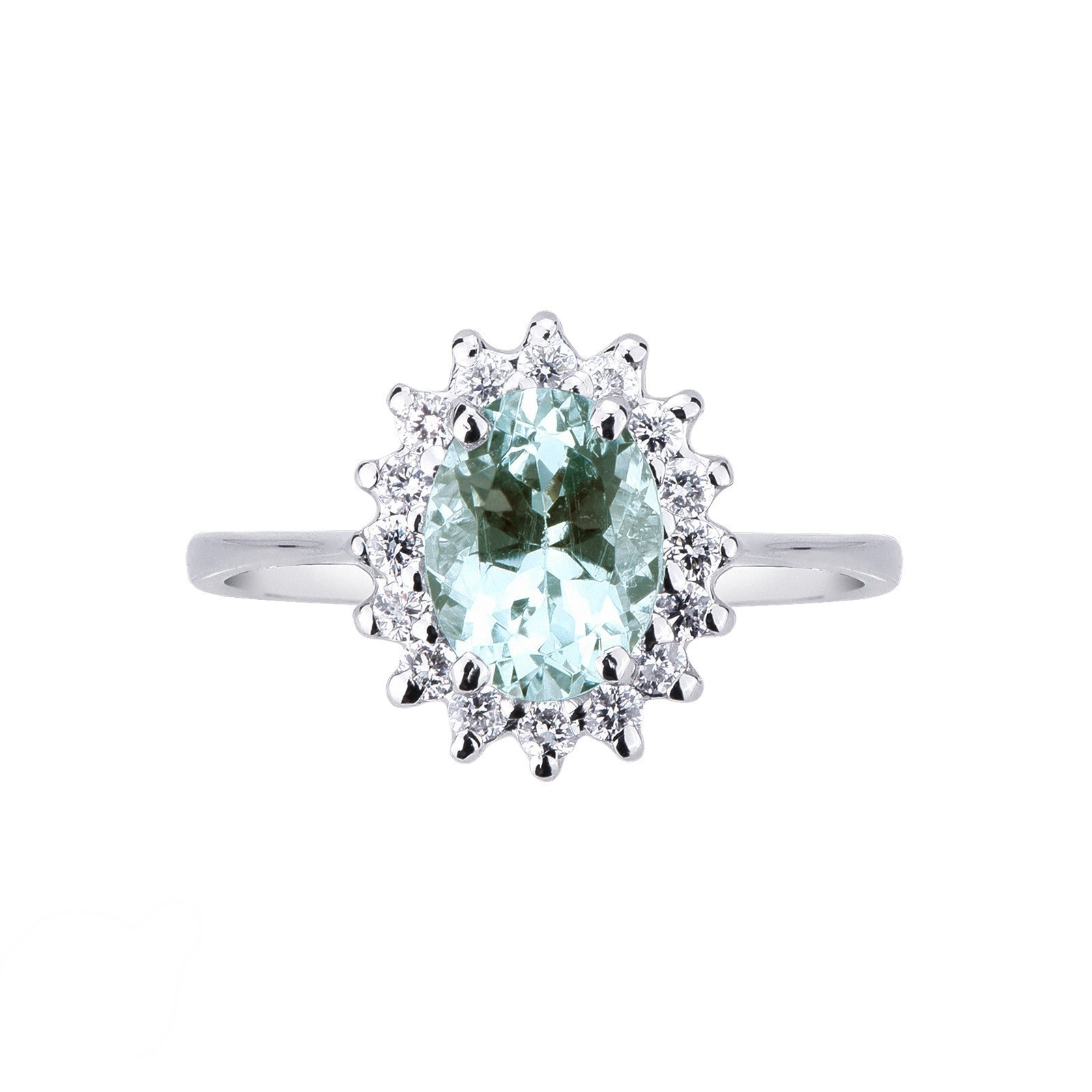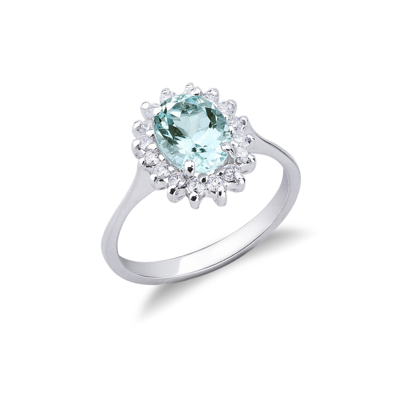 Anello contorno in Oro bianco 18k con acquamarina taglio ovale contornato da diamanti taglio brillante di colore G e purezza Vs.