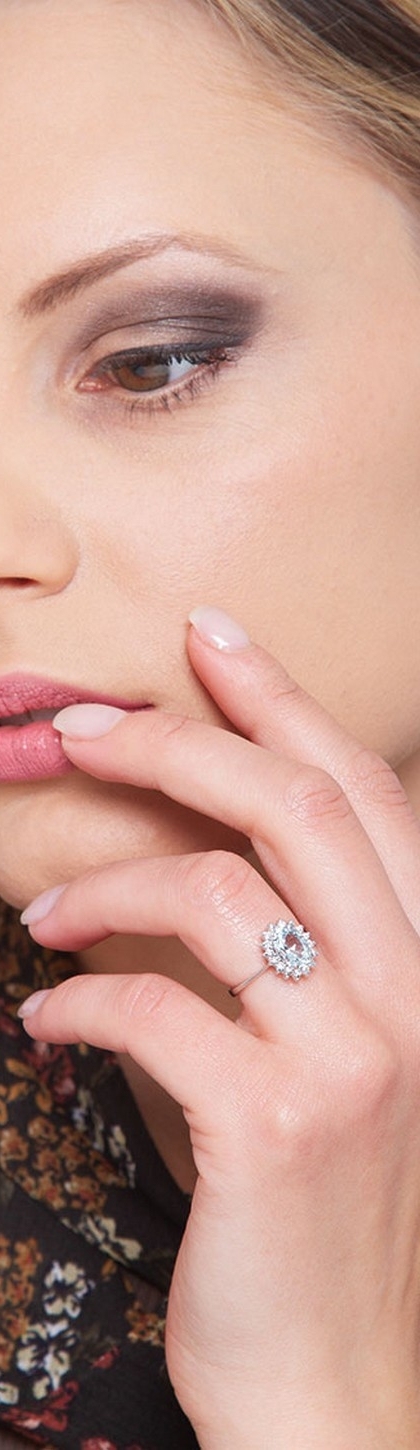 Anello contorno in oro bianco 18k con diamanti e acquamarina