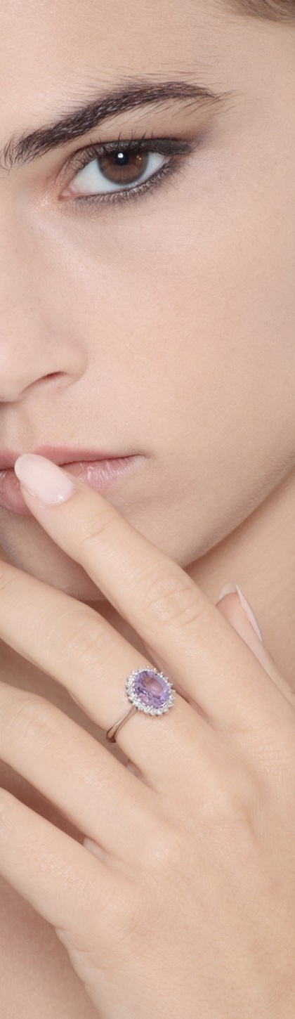 Anello contorno in oro bianco 18k con diamanti e Ametista centrale