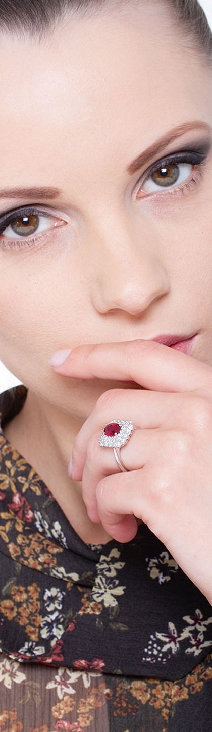 Anello contorno in oro bianco 18k con diamanti e Rubino centrale