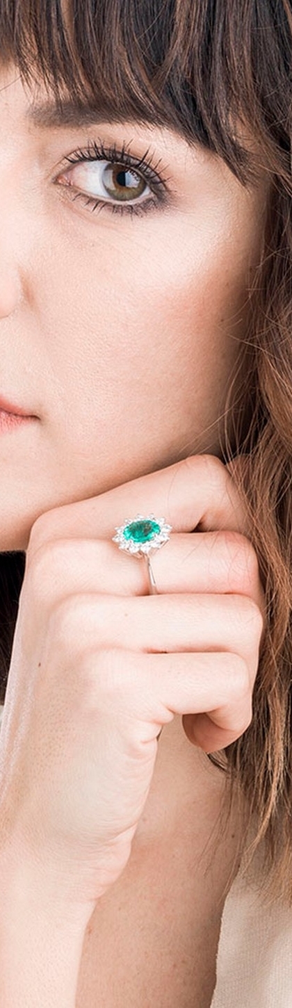 Anello contorno in oro bianco 18k con diamanti e smeraldo ovale